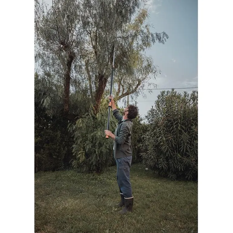 Puutarhan teleskooppileikkuri säädettävä varren pituus 2,4–4 metriä, maksimiulottuma 6 metriä. Jopa 230° säädettävä leikkuupää.