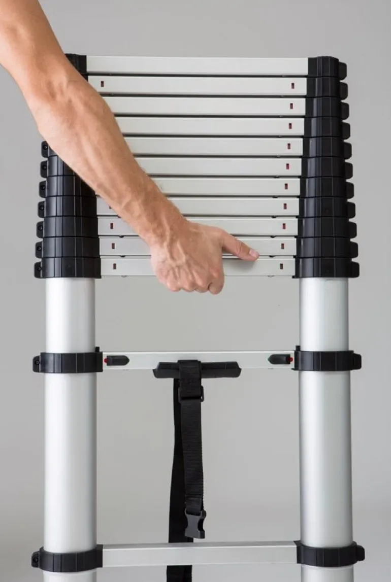 Teleskooppitikkaat eloksoitua alumiinia. Vahvat lattiasuojukset ja 40 mm syvät askelmat tekevät tikkaista turvalliset ja mukavat käyttää. Askelmien pituus on helppo säätää askel askeleelta ja sen kompaktit mitat kokoontaitetussa asennossa tekevät siitä helpon kuljettaa. Varustettu uudella ”softclose”-järjestelmällä, jonka ansiosta tikkaita on helppoa ja turvallista taittaa ja kuljettaa.