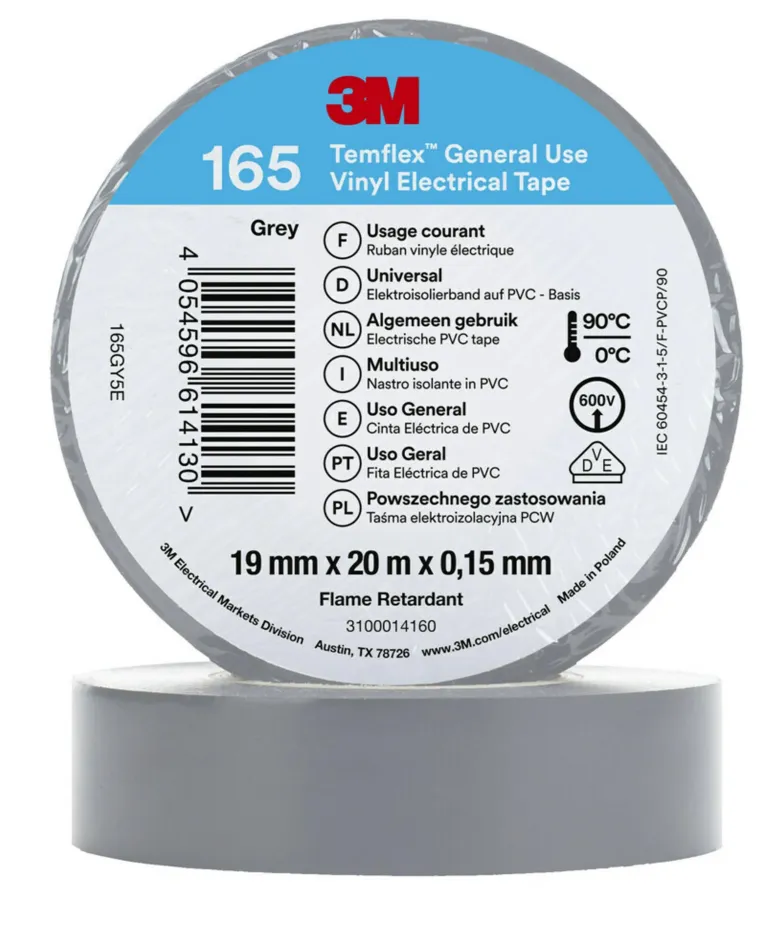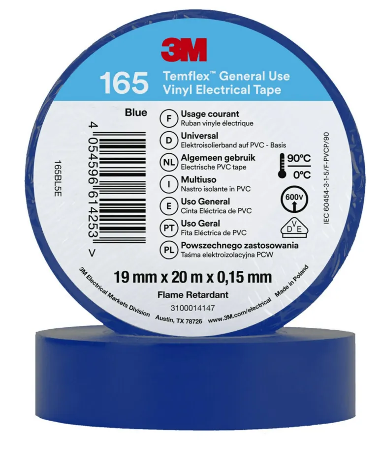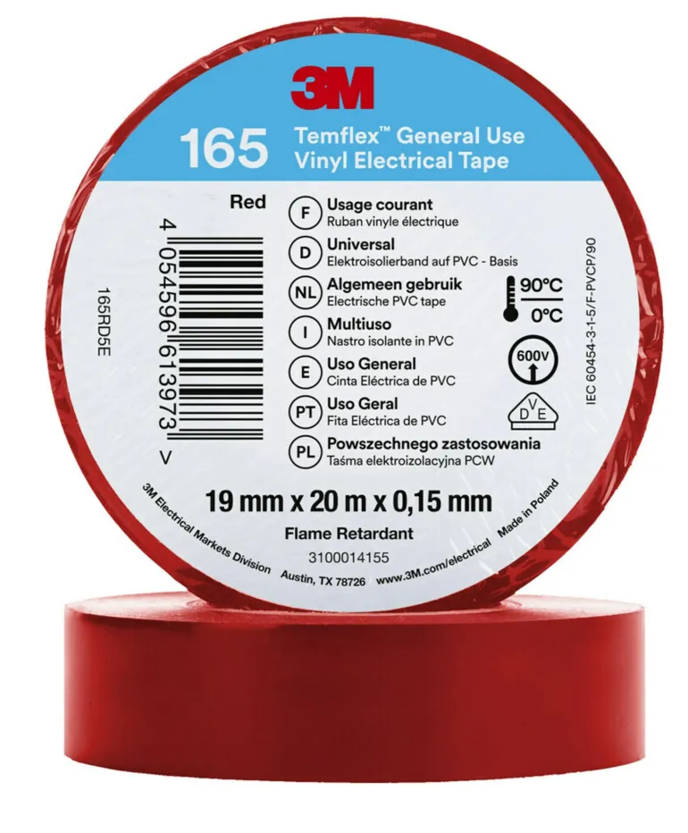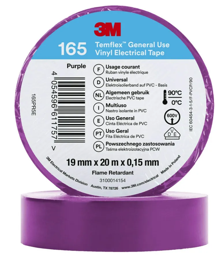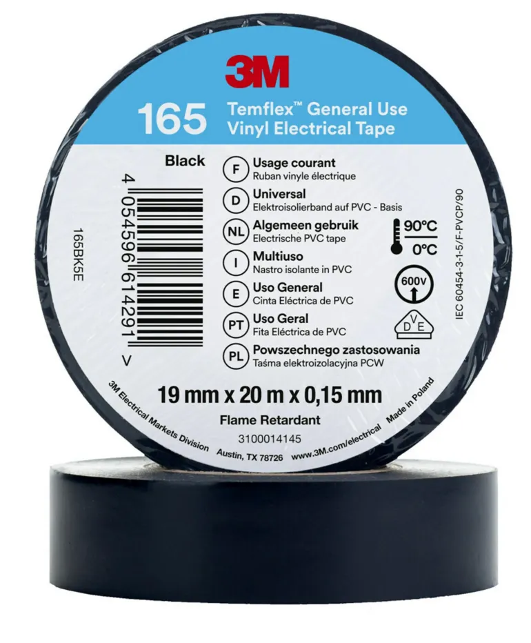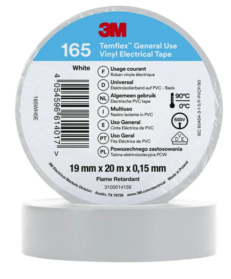3M Temflex™ -vinyylisähköteippi 165 on 0,15 mm paksu ammattitason PVC-eristysteippi, joka soveltuu sisä- ja ulkokäyttöön. Käytä 3M Temflex™ -vinyylisähköteippiä johtojen ja kaapeleiden eristämiseen (pienjännite), korjauksiin ja johdinsarjoille.