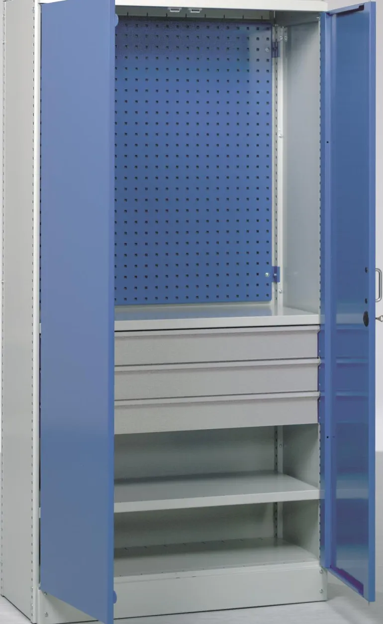 Vaaleanharmaa runko. Siniset ovet, kaksipistelukitus. Kaksi hyllytasoa ja kannattimet. 3 laatikkoa teleskooppikiskoilla 903x347x107 mm, takana rei ’itetty levy. Piilosalvat, säädettävät jalat ja trukkijalusta. Korkeus 2000 mm, leveys 1024 mm. Toimitetaan kokoamattomana.