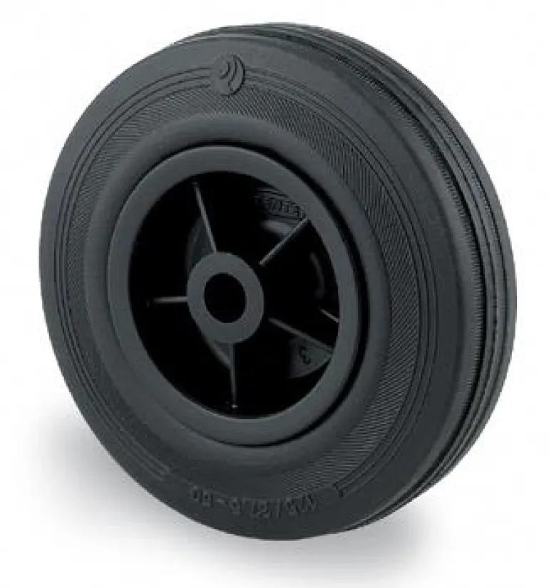 Teollisuuspyörässä on musta kumipinta ja rulla- tai liukulaakerointi.