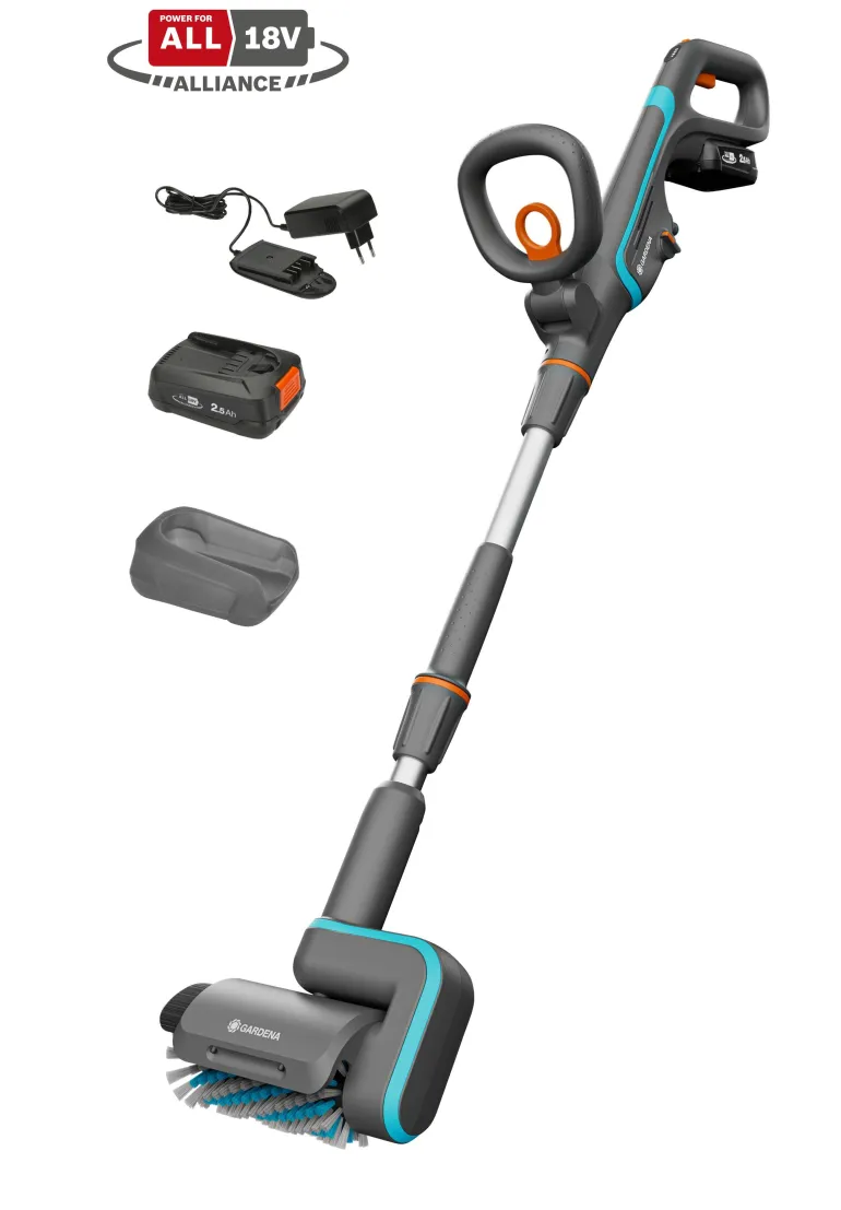 Akkukäyttöinen terassipesuri puupintojen perusteelliseen puhdistamiseen. Pesurissa puupinnoille optimoitu harjamuotoilu.