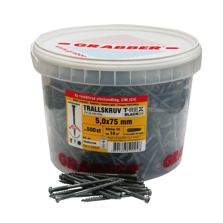 4,8 x 75 mm:n terassiruuvi, joka on tarkoitettu muun muassa terassipuun, aitojen ja laitureiden ulkoasennukseen ja ulkoasennukseen makeassa vedessä ja murtovedessä jne. puukoolaukseen, 500 kappaleen sangossa. Ruuvi on valmistettu karkaistusta hiiliteräksestä, ja siinä on halkeamia vähentävät leikkausurat (ura 17).
