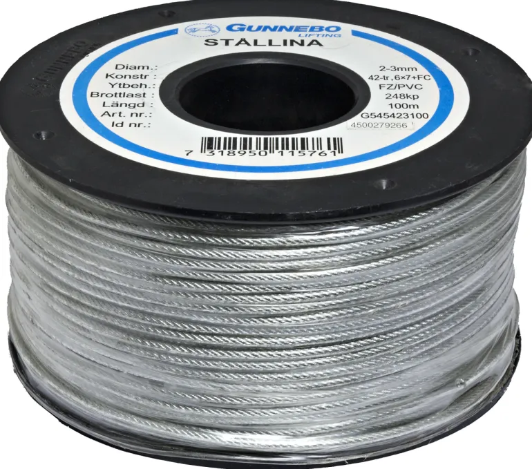 Gunnebo 204350 on muovitettu teräsvaijeri 100 m x Ø 2–3 mm pintakäsittelyllä FZ/PVC. Mastoputken kannattimena käytetään kannatinrengasta, jossa on kolme kiinnityspistettä. Vaijeri toimitetaan kelassa 100 metrin pituuksina.