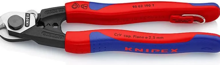 Knipex 9562190T -teräsvaijerisaksien pituus on 190 mm. Teräsvaijerisaksissa on kiinnityssilmukka putoamissuojan asennukseen ja leikkausgeometria, joka estää langan halkeamisen.