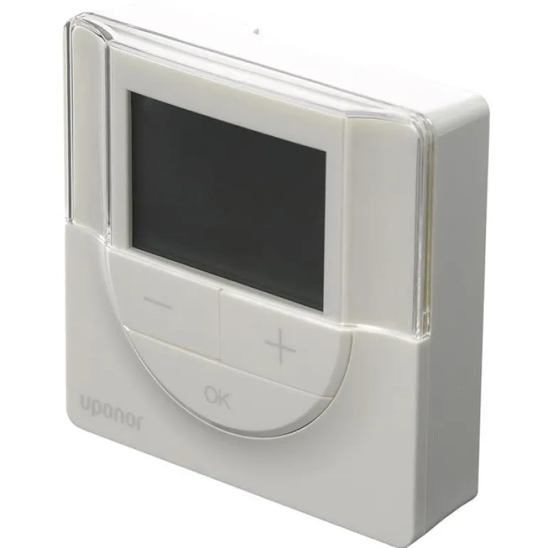 Uponor Smatrix Base T-146 on langallinen termostaatti näytöllä ja käyttölämpötilan lämpötila-anturilla. Termostaattiin voidaan kytkeä ulkoisia antureita, kuten lattia- tai ulkoanturi. Mallin mitat ovat 80 x 80 mm ja jännite 5 V.