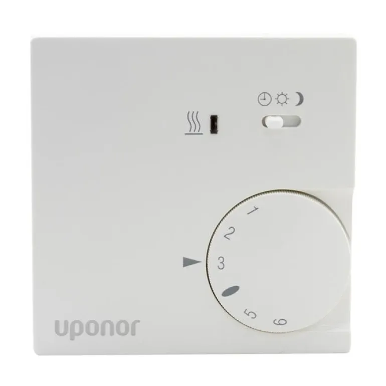 Uponor SPI COSY termostaatti NSB. Säätöpyörällä 24V. Mitat 74 x 74 x 25. Korvaa aiemmat Wirsbo Electronic- ja Wirsbo Cosy -huonetermostaatit.