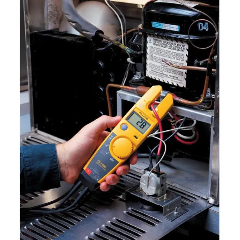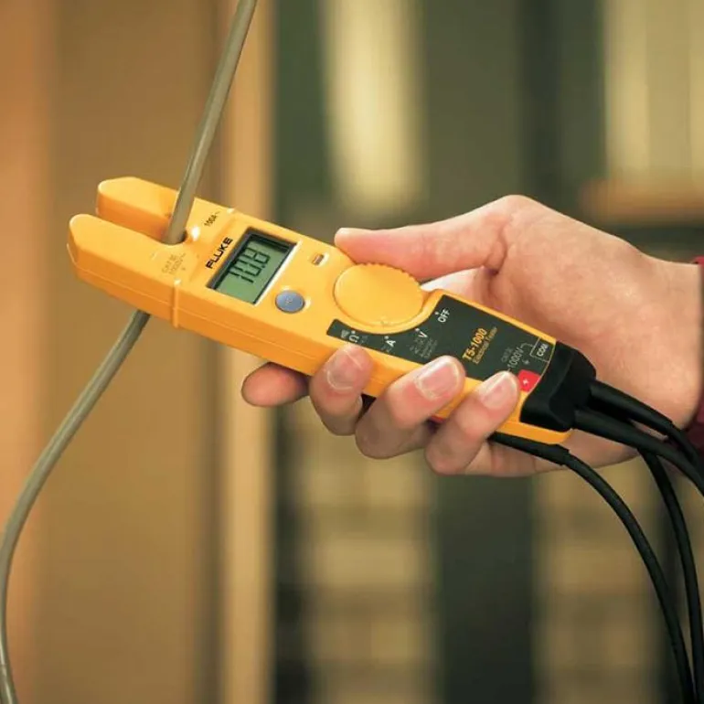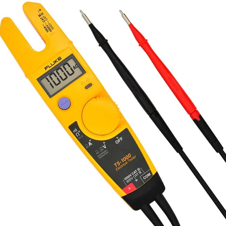 Fluke T5-1000 -testerillä voit tarkistaa jännitteet, virrat ja jatkuvuudet yhdellä ja samalla kompaktilla laitteella. Valitse voltit, ohmit tai ampeerit, niin laite tekee loput. Fluke T5-1000 on tarkoitettu 1000 voltin jännitteelle. OpenJaw-virranmittausteknologian avulla voit mitata virtoja 100 ampeeriin asti katkaisematta virtapiiriä.