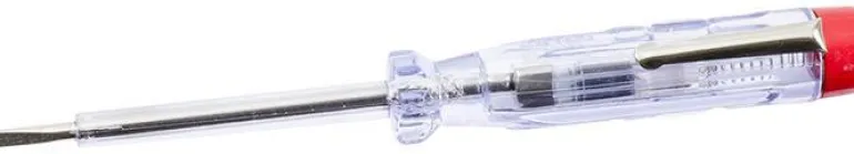 Pieni testiruuvitaltta, jossa on läpinäkyvä muovivarsi ja valo.
