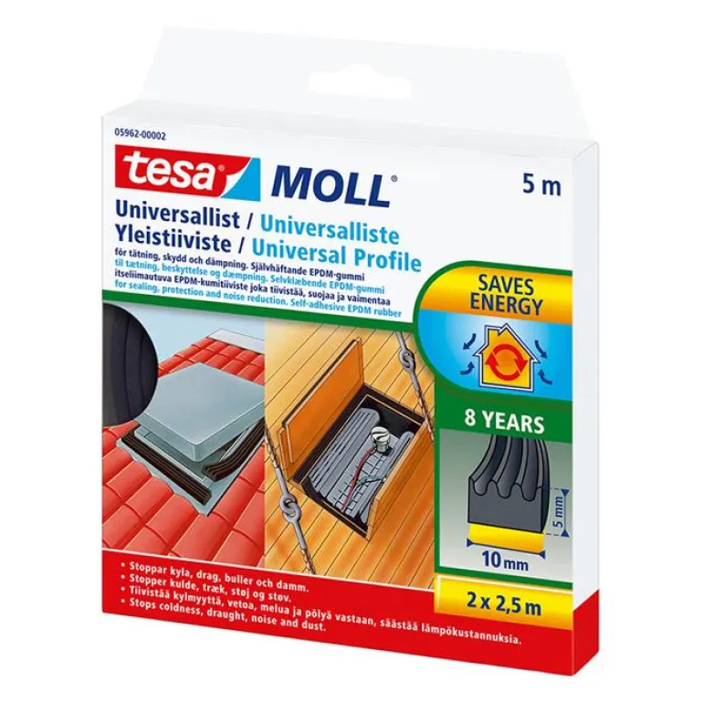 Tesa Universal 05962-00002-01 on itsekiinnittyvä, uritettu tiivistysnauha EPDM-kumia. Käytetään luukkujen, metallikaappien jne. tiivistämiseen ja vaimennukseen. Aukon koko enintään 4 mm.