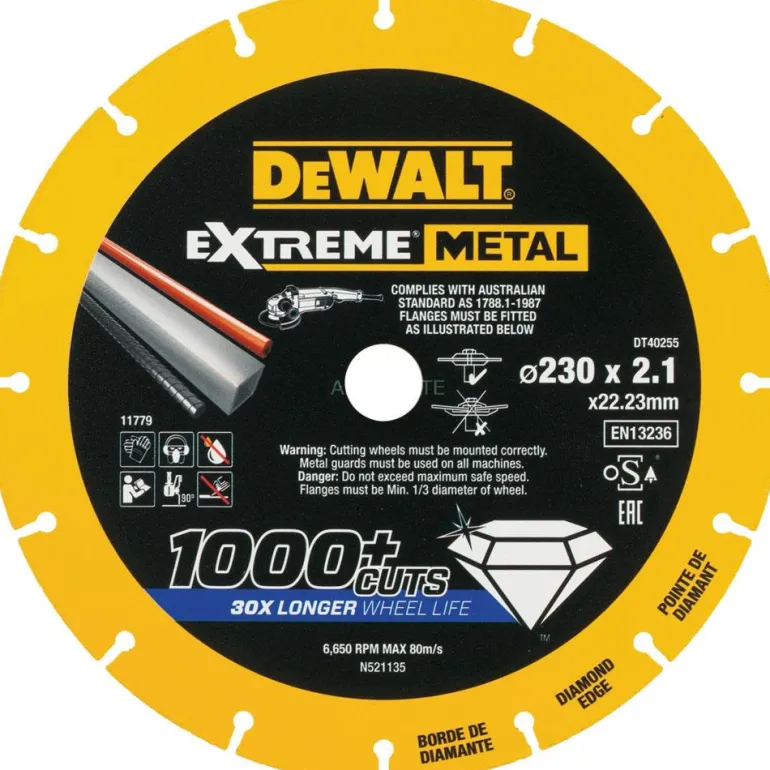 Dewalt Extreme Metal Diamond Edge -timanttikatkaisulaikan halkaisija on 230 mm ja keskireiän halkaisija 22,23 mm. Katkaisulaikan timanttireunasegmentit eivät kulu pois. Extreme Metal Diamond Edgen leikkaussyvyys pysyy samana viimeiseen leikkaukseen asti. Sopii monentyyppisille metalleille, kuten teräs, ruostumaton teräs, valurauta, raudoitusrauta, levymetalli, alumiini ja muut kuin rautametallit.