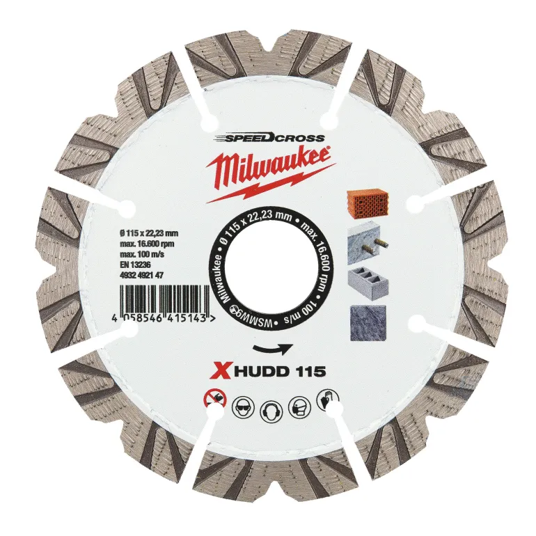 Milwaukee 4932492148 PREMIUM SPEEDCROSS XHUDD 125 mm -timanttikatkaisulaikka, jonka tarkasti sijoitellut timantit tuottavat erinomaisen katkaisujäljen. Soveltuu kaikenlaisille koville rakennusmateriaaleille. 12 mm:n segmenttikorkeus. Laserhitsatut, lyhyet hammassegmentit mahdollistavat aggressiivisen katkaisemisen.