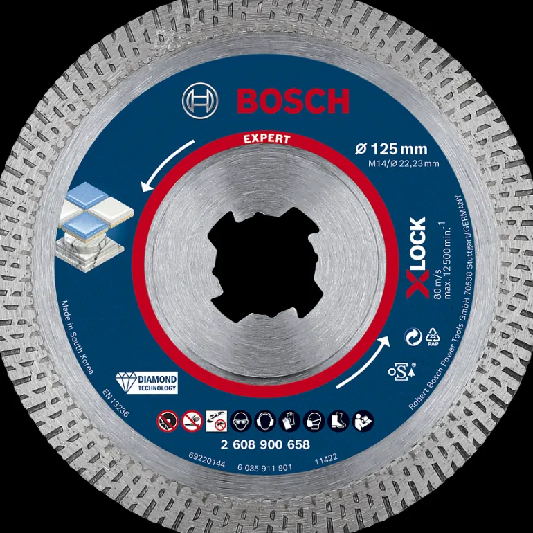 Bosch EXPERT HardCeramic X-LOCK-timanttikatkaisulaikka X-LOCK-pikakiinnityksellä (sopii myös ruuvikiinnitteisiin kulmahiomakoneisiin). Pienille kulmahiomakoneille 22,23 mm:n reikähalkaisijalla. Suunniteltu lujien laattojen tarkkaan leikkaamiseen. Soveltuu materiaaleille: kivilaatat ja kova kivi.