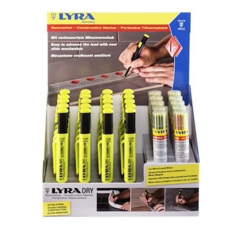 Lyra Dry Profi Display on 20 kpl Dry Profi nikkarinkyniä syvien reikien merkitsemiseen. Dry Profi tarttuu sekä likaisiin että öljyisiin pintoihin, ja pitkä kärki, joka yltää helposti ruuvinreikien läpi. Syöttö ruostumattomasta teräksestä valmistettua kynän putkea napsauttamalla. Teroitinta on helppo käyttää, ja kärjen voi teroittaa irrottamatta hylsyä vyöstä. Lyra Dry Profi Display n mukana tulee grafiittilyijy.