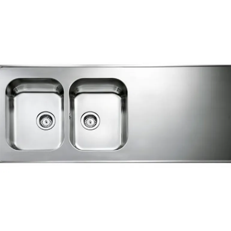 Täysmittainen tiskipöytä kahdella suurella tiskialtaalla ja valutustasolla. Toimitukseen sisältyy koriventtiilit, ylivuotoaukko ja vesilukko.