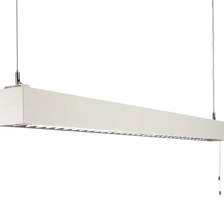 Riippuva toimistovalaisin, jonka valovirta on 6200 lm ja jossa on kaksi vetohimmennintä, 49 W. Toimistovalaisin täyttää enintään 12 m²: n kokoisille toimistoille asetetut vaatimukset, ja siinä on kaksinkertainen parabolinen häikäisysuoja 70 prosentin ylösvalolla ja 30 prosentin alasvalolla, mikä luo hyvin himmennetyn valokuvion.