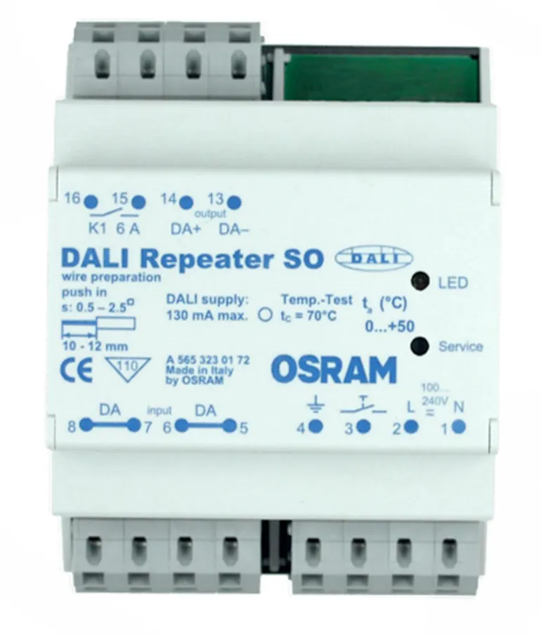 OSRAM DALI Repeater mahdollistaa DALi-järjestelmän laajentamisen. Osoitteellisuuden ansiosta toistinta voidaan ohjata ja konfiguroida järjestelmän sisällä. Toistimiin liitetyt HF-yksiköt toimivat automaattisesti ryhmänä, jolla on yhtenäinen himmenninasetus. Touch DIM -tilassa toistimet toimivat erillisinä säätiminä, joilla ohjataan manuaalisesti jokaista DALI HF -laitetta vakiokytkimillä. DALI-järjestelmien laajentaminen jopa 64 HF-laitteella osaa kohden. Pidentää DALI-linjaa 300 metrillä.