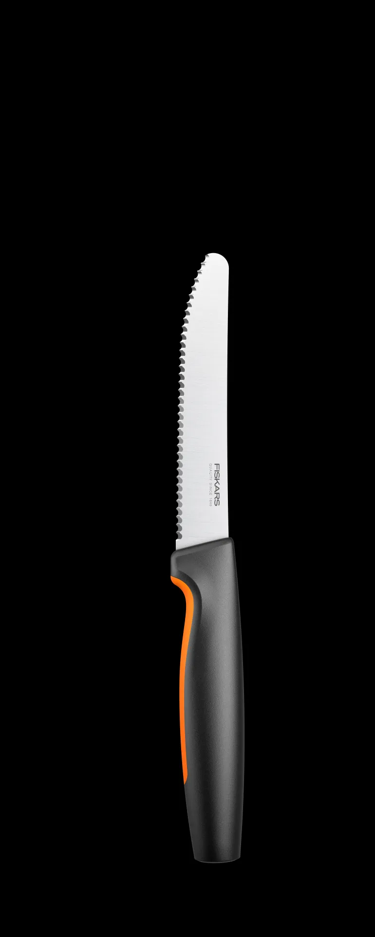 Hammastettu terä, joka sopii täydellisesti ohuen kuoren leikkaamiseen. Veitsenterä on valmistettu kestävästä japanilaisesta ruostumattomasta teräksestä. Ergonomisesti suunnitellussa kahvassa on hyvin asennettu sormensuojus. Konepesunkestävä.