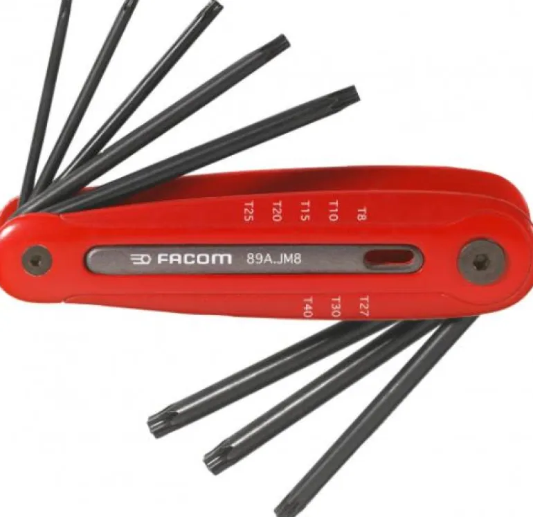 Facom 89.JL8 -torx-avainsarja sisältää kahdeksan avainta, jotka sijaitsevat kätevässä pidikkeessä. Avaimet ovat yhteensopivia standardoitujen torx-määritysten kanssa.