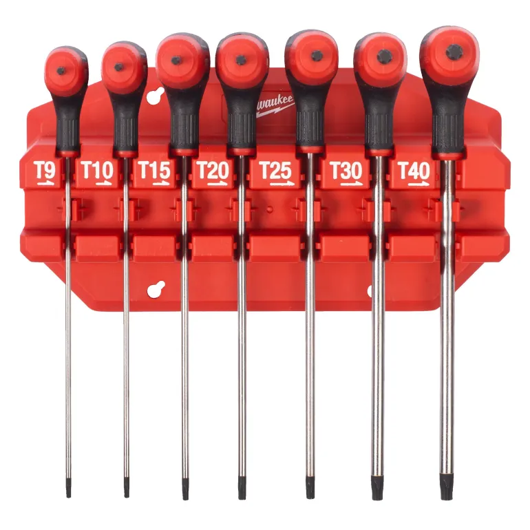 Torx-ruuvitaltta T-kahvalla ja T-STRIKE™-iskupäällä, jonka täysmetallinen ydin suojaa työkalua. Muotoilu parantaa pääsyä pyöristyneisiin tai ruostuneisiin pultteihin. Lyhyt pää on varustettu Torx-kärjellä paremman kestävyyden takaamiseksi ja pitkällä puolella murtosuojattu Torx-kärki turvaruuveille. Työkalussa kokomerkinnät. Magneettinen säilytyslokero esiporatuilla rei’illä ja kokomerkinnöillä. Sisältää koot T9, T10, T15, T20, T25, T30, T40 ja telineen.