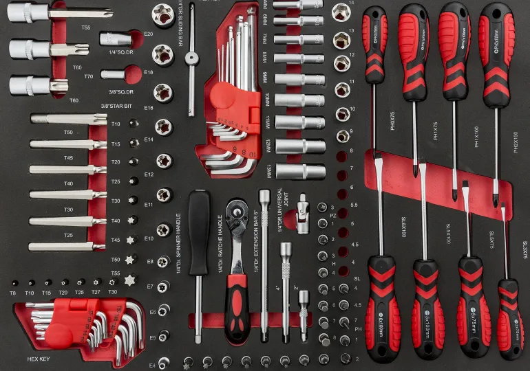 117-osainen torx- ja ruuvitalttasarja, joka sisältää kromivanadiiniteräksestä valmistettuja ruuvitalttoja lajiteltuna vaahtomuoviseen moduuliin, jossa on oma paikka ja merkintä kullekin työkalulle.