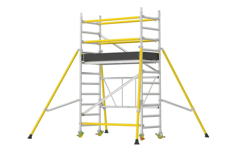 Taittuva pohjaosa helpottaa käsittelyä ja kuljetusta. Pinoutuva rakenne lisää turvallisuutta ja vakautta. Sisältää tason ja vinoaskelmat kahden metrin välein ylös asti. Lukittavat pyörät (125 mm). Pitkittäislevy ja tukijalka. (Kuvassa on kokonainen työtaso – tuotenro 374644.)