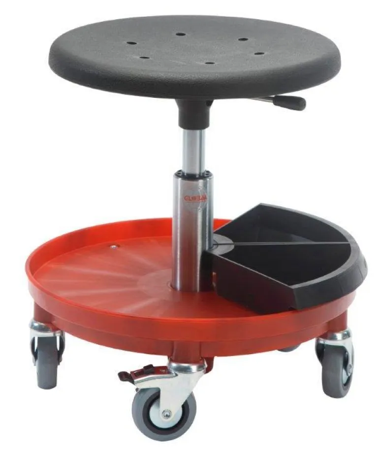 Tuolissa on vaahtomuovi-istuin ja kaksi kahvaa korkeudensäädöllä. Vakaa alusta, jossa työkaluhylly, ja viisi kääntyvää pyörää, joista kahdessa jarru.