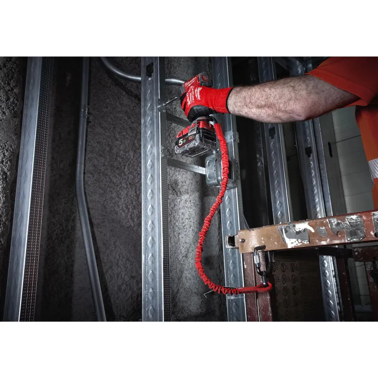 Milwaukee-työkalun varmennusosa kaksinkertaisella karbiinihaalla, enimmäispaino 4,5 kg. Ylivertainen iskunvaimennus, joka pysäyttää työkalun joustavasti putoamisen sattuessa.