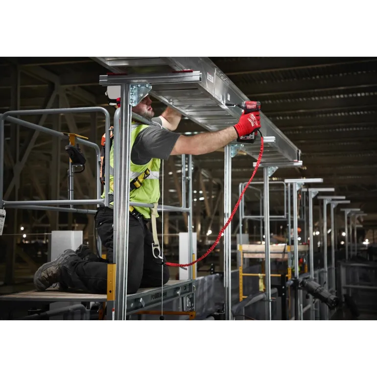 Milwaukee-työkalun varmennusosa kaksinkertaisella karbiinihaalla, enimmäispaino 4,5 kg. Ylivertainen iskunvaimennus, joka pysäyttää työkalun joustavasti putoamisen sattuessa. Työkalun varmennusosa on monipuolinen työväline, koska turvaköysien lisävarusteet voidaan liittää eri työkaluihin.