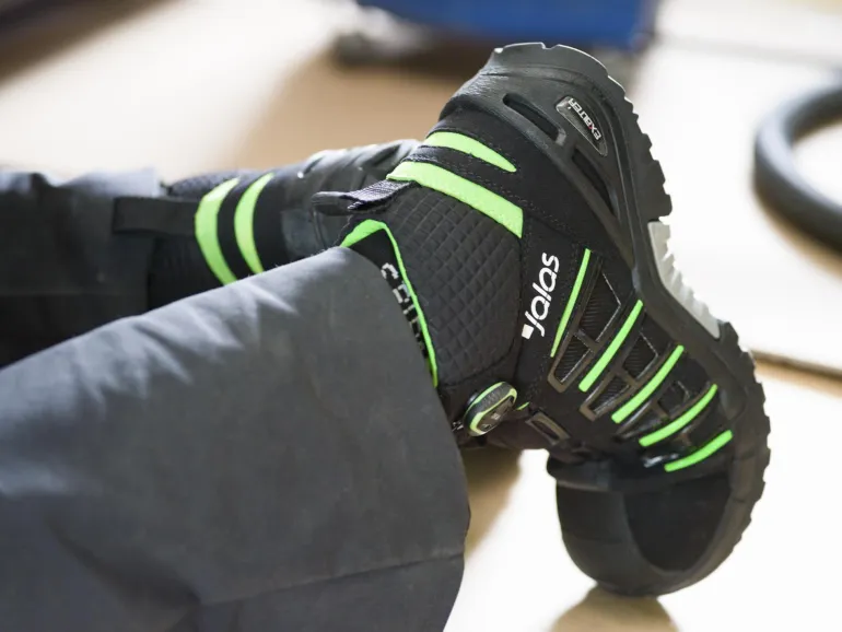 JALAS® EXALTER 9945 on varrellinen turvajalkine, jossa on kaikki mitä tarvitset useimpiin työtilanteisiin: PTC-tekstiilinen naulaanastumissuoja, alumiininen varvassuoja ja Vibram-nitriilikumipohja. Malli tarjoaa ylimääräistä nilkkatukea ja PORON® XRD™-iskunvaimennus estää jalka- ja selkävammat. Verkkopäällysteiset tuuletusaukot päällisessä pitävät jalat viileinä ja estävät hiekan pääsyn jalkineisiin. BOA®-kiinnitysjärjestelmä helpottaa jalkineen pukemista ja riisumista.