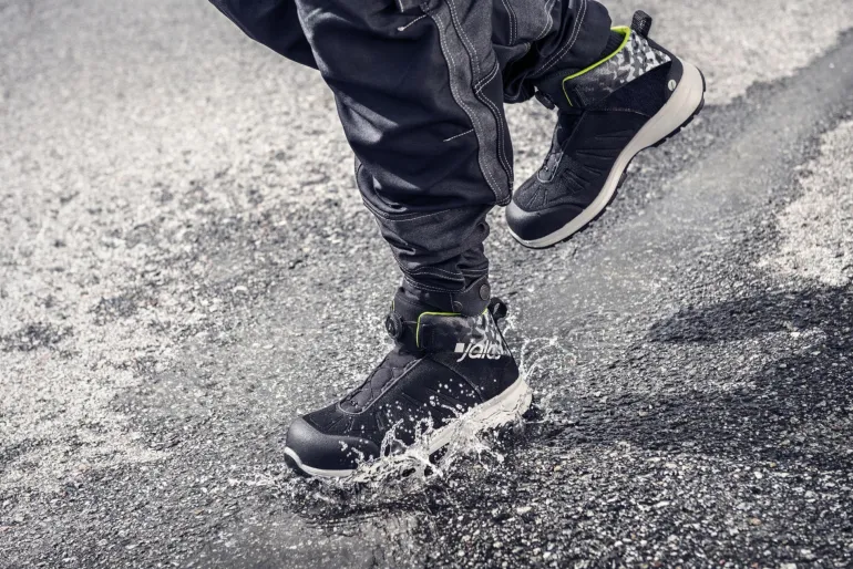 Uusi kevyt varrellinen turvajalkine, jossa ylimääräinen nilkkatuki, tekstiilineulospäällinen ja BOA®-kiinnitysjärjestelmä. Erinomainen ergonomia, Memory foam-pehmuste ja vedenhylkivyys antavat hyvän käyttömukavuuden koko päiväksi. Öljynkestävä RPU-ulkopohja lisää pitoa ja hengittävä sisäpohja pitää jalat viileinä. Turvajalkine on lisäksi varustettu alumiinisella JALAS®-varvassuojalla, plasmakäsitellyllä tekstiilisellä pistosuojalla ja kaksinkertaisilla PORON® XRD®-iskunvaimennusvyöhykkeillä.