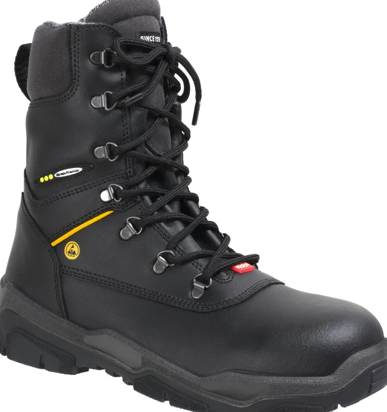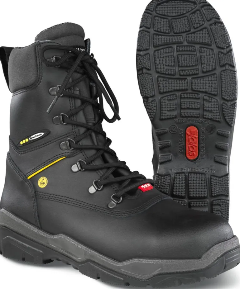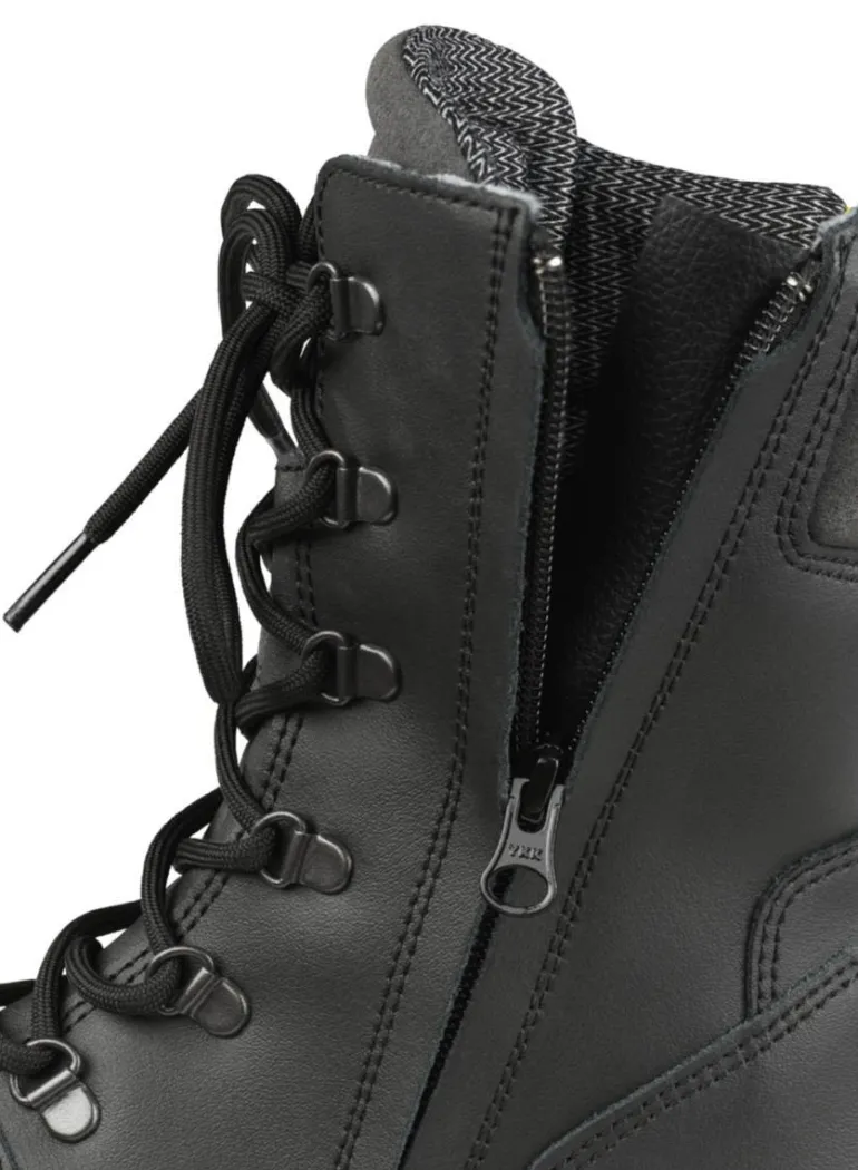 Turvasaapas (talvimalli), jonka varvassuojan materiaali alumiini. PU-välipohja, muovilenkkituki, kumi-ulkopohja ja päällismateriaali PU-pintainen nahka.