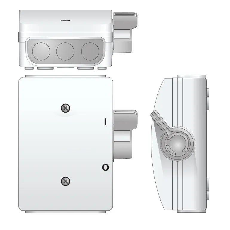Pinta-asennettava turvakytkin. Varustettu sisäänrakennetulla jännitteenpoistolla yhdelle tai kahdelle lähtevälle liitäntäjohdolle ja kolmella kaapelin sisäänmenolla ylä- ja alareunassa.