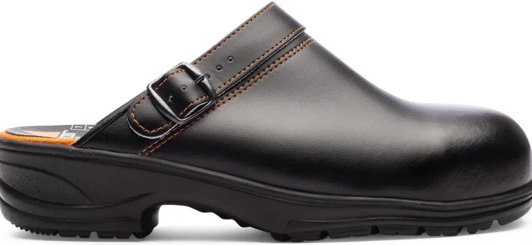 Klassinen turvapistokas kestävällä pu-päällysteisellä nahkapinnalla. Sisäpohja on valmistettu Texonista ja lähinnä jalkaa on pehmeä lateksipohjallinen, joka on päällystetty kosteutta imevällä Cambrellen tekstiilillä. Sisäpohja on myös ergonomisesti suunniteltu ja siinä on jalkapohjan kaarituki ja varvastuki. Ulkopohjassa on iskua luistamaton pinta, joka on sertifioitu SRC:n mukaisesti. Kantahihna on joustava ja säädettävissä kaikille käyttäjille sopivaksi. Ilman rei’itystä.