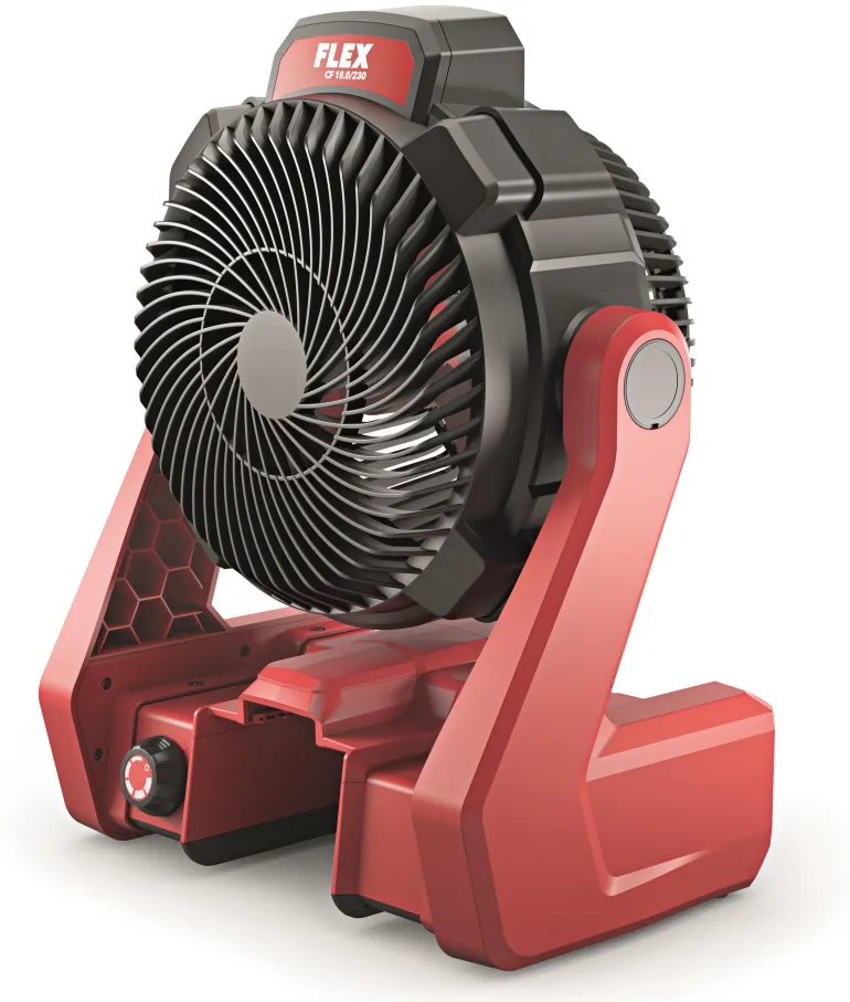 FLEX CF18. 0/230 SOLO on tuuletin, jossa elektroninen EMS-ohjausjärjestelmä, joka suojaa laitetta, pidentää käyttöikää ja lisää tehokkuutta. Voidaan käyttää FLEX 18 V-akulla tai liitettynä verkkovirtaan (230 V). Käyttöaika maksiminopeudella n. 2,2 h (2,5 Ah-akulla)/4,5 h (5,0 Ah-akulla). Joustava käyttö koukun, 1/4″- ja 5/8″-kiinnityksen ja 180° käännettävän pään ansiosta.