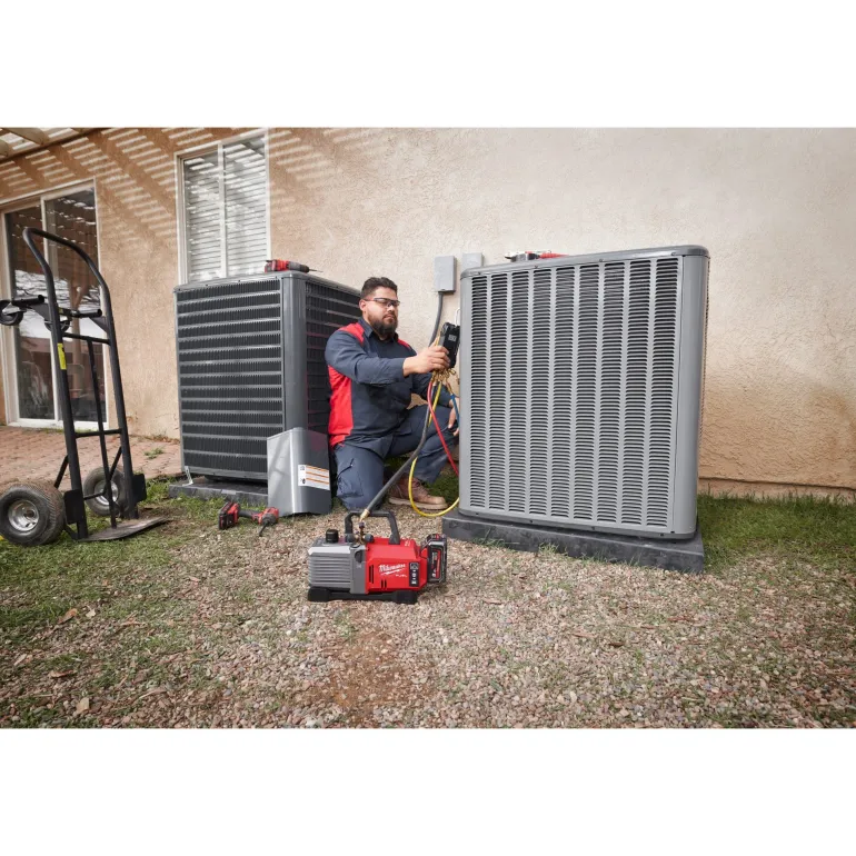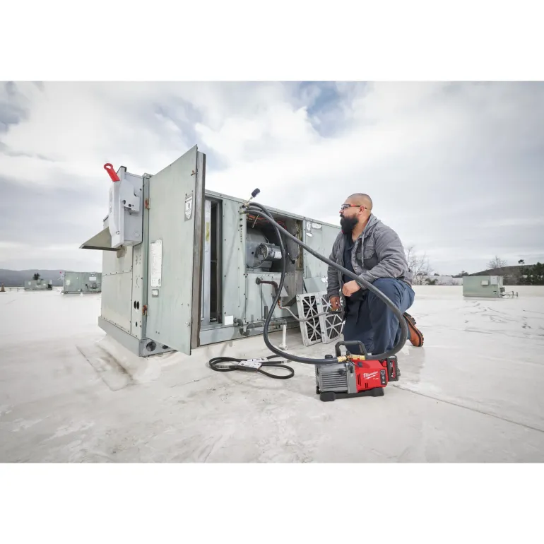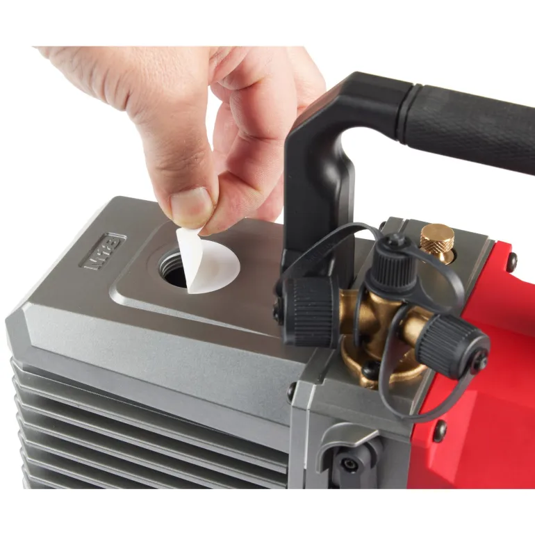 Milwaukee M18 FUEL™ -tyhjiöpumppu 5 CFM jopa 90 minuutin käyttöajalla Manifold-tilassa ja 60 minuutin käyttöajalla oletustilassa suorassa tyhjiöinnissä yhdellä M18™ HIGH OUTPUT™ 8,0 Ah -akulla. Ilman akkua ja laturia, mukana 5/16″ -sovitin.