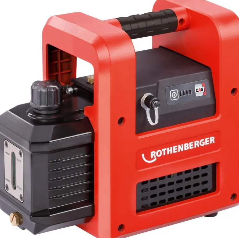 Rothenberger 18 V paristokäyttöinen tyhjiöpumppu esimerkiksi ilmastointi- ja lämpöpumppujen asentamiseen. Pumpun käyttöaika on jopa 90 minuuttia 8 Ah akulla.
