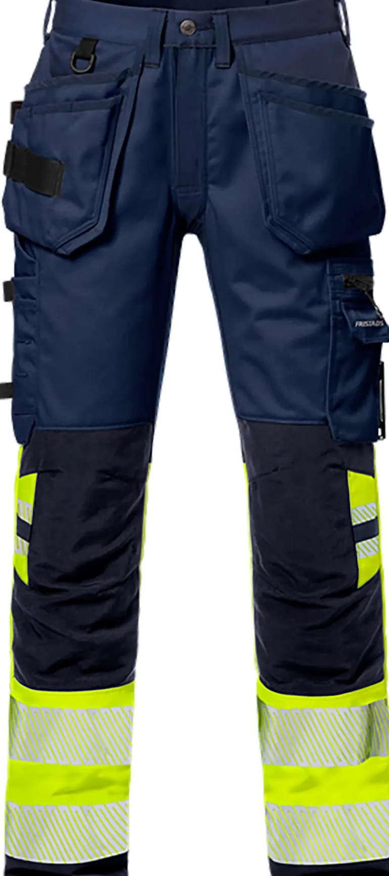 Työhousut, joissa 4 suuntaan joustavasta materiaalista valmistettu vyötärö, sivut, takaosa ja haara. Housuissa on useita taskuja, kuten kaksi CORDURA-vahvistettua vapaasti roikkuvaa naulataskua ja taittomittatasku, jossa työkalutasku, kynätasku ja nappi sekä lenkki puukolle.