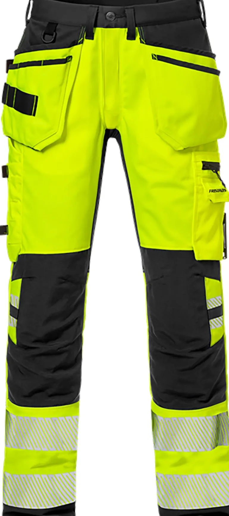Työhousut, joissa 4 suuntaan joustavasta materiaalista valmistettu vyötärö, sivut, takaosa ja haara. Housuissa on useita taskuja, kuten kaksi CORDURA-vahvistettua vapaasti roikkuvaa naulataskua ja taittomittatasku, jossa työkalutasku, kynätasku ja nappi sekä lenkki puukolle.