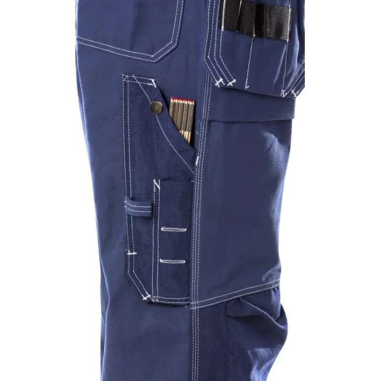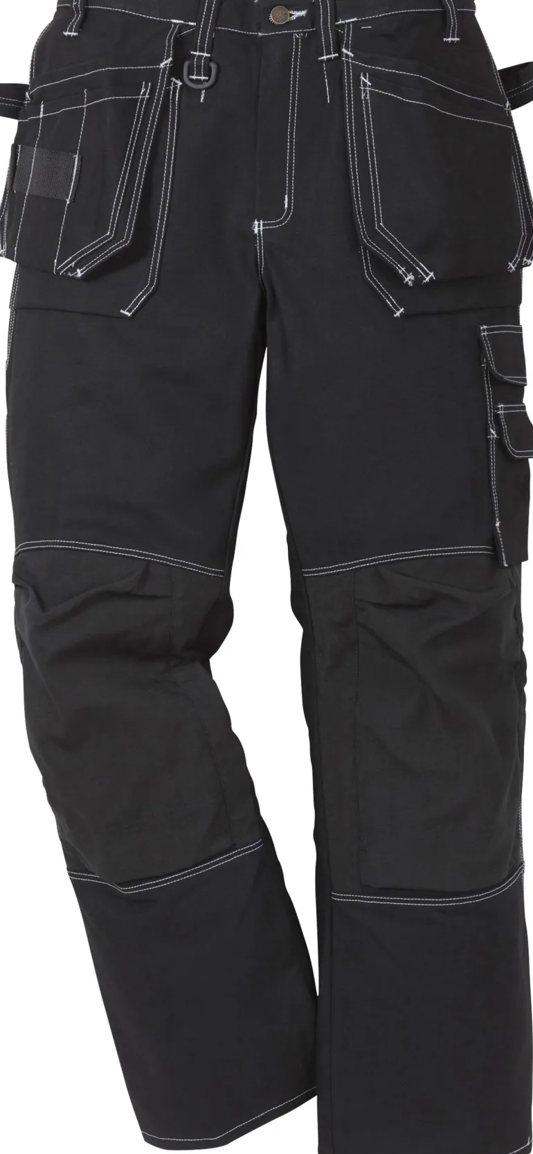Työhousut FAS-puuvillaa, kaksi vapaasti riippuvaa CORDURA-vahvisteista sisääntaitettavaa naulataskua – toisessa lisätasku, toisessa 3 pienempää taskua ja työkalulenkit. Housuilla on Öko-Tex-sertifiointi, ja ne on hyväksytty standardin EN 14404 mukaisesti yhdessä polvisuojien 9200 KP kanssa.