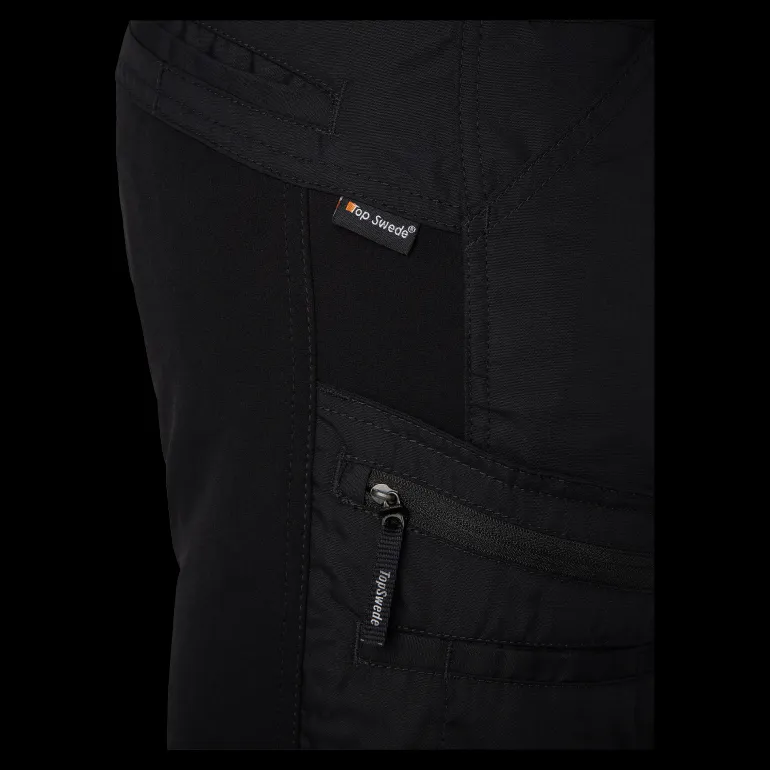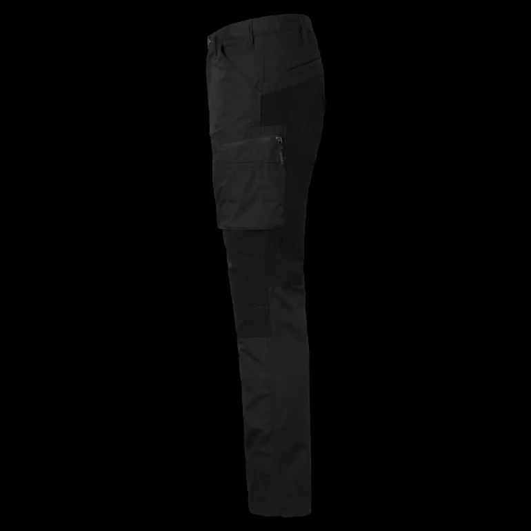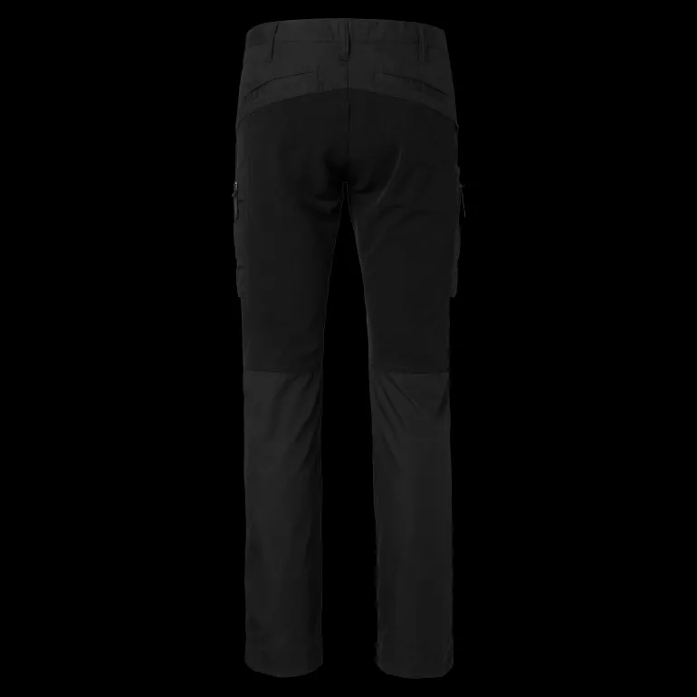 Modernit työhousut joustavaa materiaalia, jotka sopivat hyvin esim. huolto- ja muihin vastaaviin töihin. Muotoonommellut lahkeet. Kaksi takataskua ja kaksi etutaskua, joista toisessa on lisätasku. Kaksi palkeellista ja vetoketjullista reisitaskua, joissa on puukko- ja kynäpidikkeet. Oikeassa reisitaskussa on iso lisätasku ja puhelintasku. D-rengas. Lahkeita voi pidentää 5 cm. Stretchpaneelit valikoiduissa kohdissa parantavat liikkuvuutta. Takamuksessa, haarassa ja polvissa stretchosiot nailonia/Spandexia. Muu kangas mekaanista stretchmateriaalia. Pidennettävät lahkeet. Päämateriaali: 65 % polyesteri, 35 % puuvilla. Joustomateriaali: 94 % nailon, 6 % elastaani. Pesuohje: Konepesu 60 °C.