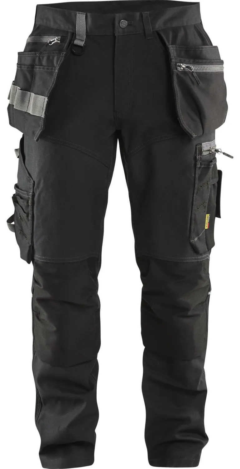Mukavat ja joustavat työhousut, jotka eivät jätä mitään sattuman varaan kestävyyden, mukavuuden ja käytännöllisyyden osalta. Edessä, pohkeissa ja kaarrokkeessa on joustavat kaitaleet mahtavasta 4-suuntaisesta joustomateriaalista, ja haaroissa hyvin hengittävää 2-suuntaista joustomateriaalia. Joustavat CORDURA®-vahvikkeet polvitaskuissa, vahvikkeet naulataskuissa, taittomittataskussa, takataskuissa ja lahkeensuiden takaosissa. Materiaali: 60 % puuvillaa, 40 % polyesteria, canvas, 340 g/m². Pesuohje: 40 °C.