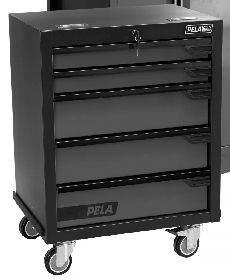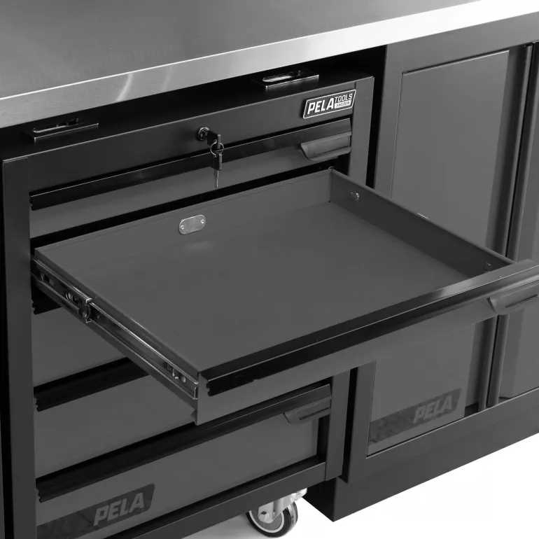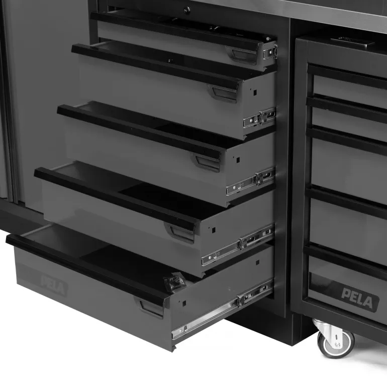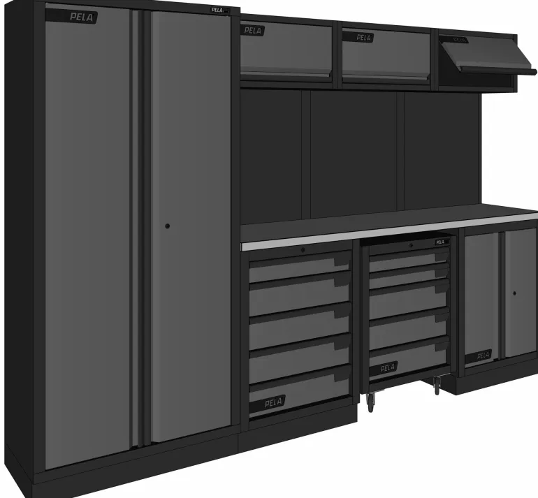 PELA 546213 on täydellinen kalustekokonaisuus autotalliin tai työpajaan (harmaa/musta), joka sisältää myös työkaluvaunun. Hitsaamalla valmistetut kaapit, jotka on helppo yhdessä työkalutaulujen kanssa koota yhdeksi vakaaksi moduuliksi tai työpistekokonaisuudeksi. Kalusteessa on paljon käytännöllisiä kaappeja, laatikoita ja säilytystiloja, joiden avulla voit järjestää työkalusi ja tarvikkeesi. Mukana tuleva ruostumattomasta teräksestä valmistettu työtaso on kestävä ja tyylikäs. Moduuli sisältää myös pyörillä varustetun työkaluvaunun, jota voidaan helposti siirrellä työtilassa ja varastoida työtason alle, kun tarvitaan enemmän tilaa. Työkalutaulut ovat yhteensopivia PELAn työkalukoukku- ja lisävarustevalikoiman kanssa. Korkea kaappi voidaan sijoittaa kalusteen molemmille puolille. Lähin värikoodi harmaa RAL 7016.