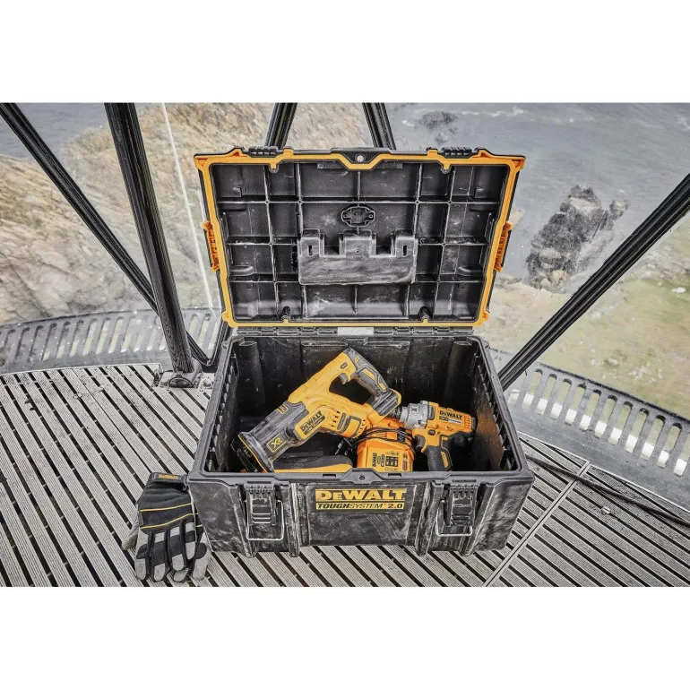 Työkalupakki/työkalulaatikko ToughSystem 2.0 DS300, jossa patentoidut automaattiset pinoamissalvat moduulien yhteenliitäntää varten, mikä helpottaa käsittelyä ja käyttöä – myös yhdellä kädellä. Kaksiosaiset metalliset salvat edessä lisäävät kestävyyttä. IP65-luokiteltu pölyn- ja vedenpitäväksi, kuormituskapasiteetti 50 kg. Työkalulaatikossa on irrotettava työkalutarjotin, joka helpottaa järjestelyä. Yhteensopiva kaikkien ToughSystem-tuotteiden kanssa.