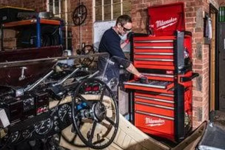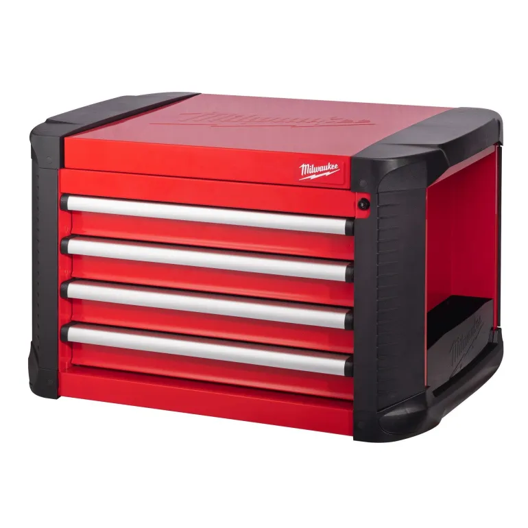 Milwaukee 4932478850 teräksinen työkalulaatikko 4:llä 45 kg painoa kestävillä pehmeästi sulkeutuvilla vetolaatikoilla. Vain yksi laatikko voidaan avata kerrallaan kallistumisen estämiseksi. Jokaisessa vetolaatikossa on matto, mikä estää tavaroiden liukumisen. ABS-kulmapuskurit estävät vaurioita, kun vaunua siirretään. Sivuhyllyt pulloille ja tölkeille.