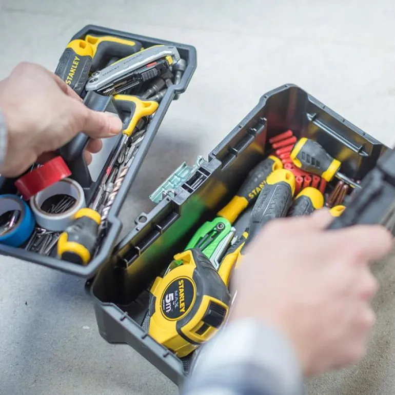 12,5″ työkalulaatikko, jossa on ergonomiset metallikiinnikkeet. ”Essential”-työkalulaatikossa on innovatiivinen muotoilu. Kannessa on säilytyslaatikoita pikkutavaroille. Munalukon kiinnike parantaa turvallisuutta. Lukkopidikkeiden ansiosta laatikon avaaminen ja sulkeminen on helppoa.