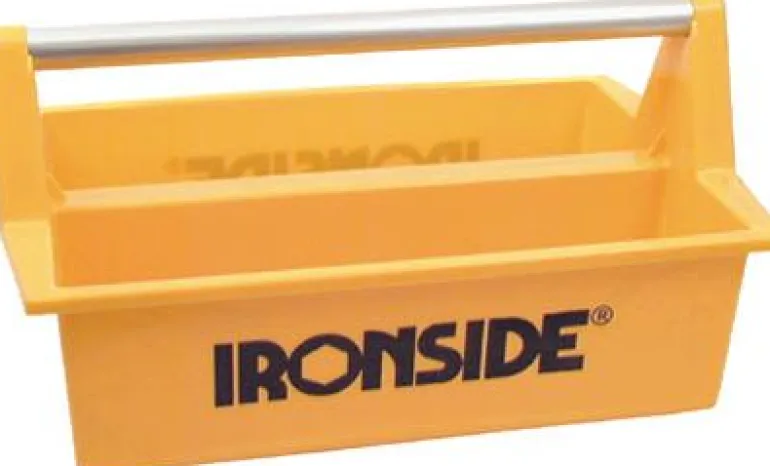 Iskunkestävää vahvaa keltaista muovia, kaksi avointa lokeroa ja reilu metallikahva Koko: 396x294x215