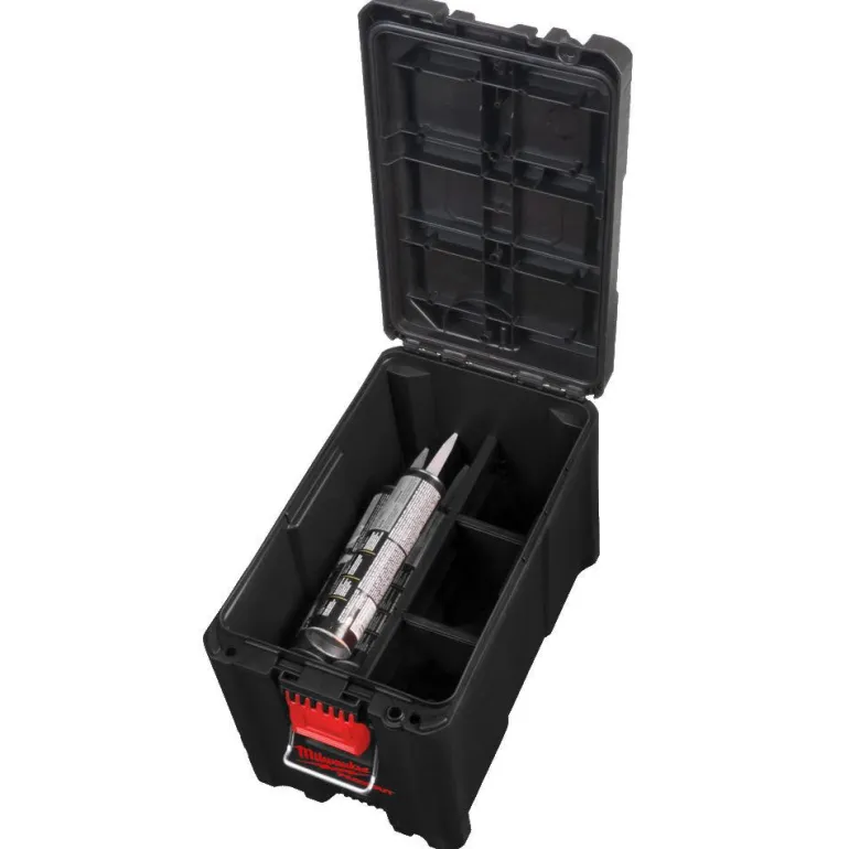 Milwaukee Packout Compact Box on IP65-luokiteltu työkalulaatikko, jonka koko on 411 x 254 x 330 mm ja joka kestää jopa 34 kg.