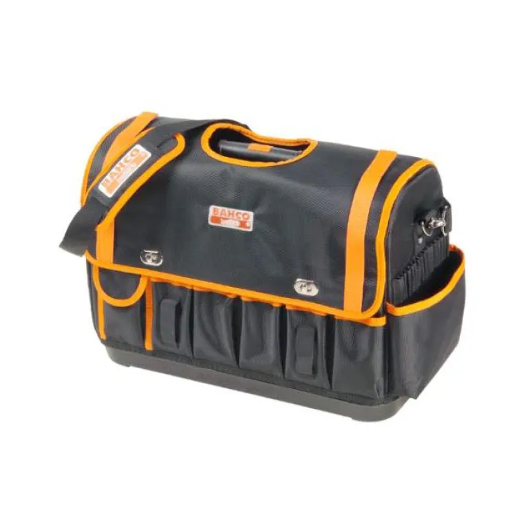 Käytännöllinen työkalulaukku, jossa on sisä- ja ulkolokerot, kahva sekä olkahihna. Mitat: 470x230x355 mm.