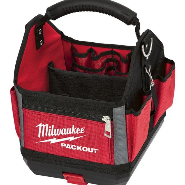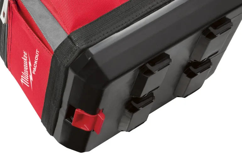 Milwaukee Packout-työkalulaukku 250x280x320 mm, jossa 28 taskua ja iskunkestävä muovattu pohja.